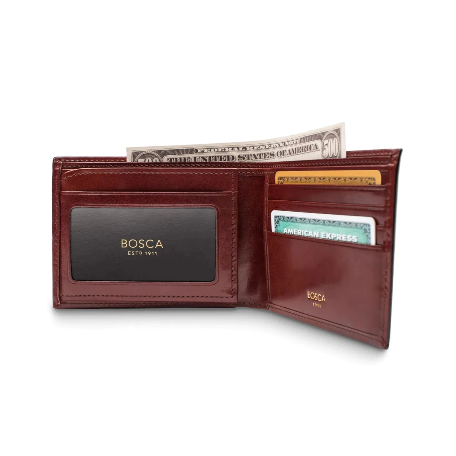 With an iconic design and unwavering versatility, this feature-rich, traditional bifold is ideal as a daily carrier. Its functional silhouette adds an ID flap for variety, and features eight orderly horizontal card pockets, along with a pair of hidden vertical pockets. All this, housed in a lustrous brown hand-stained Old Leather presentation. A cash well is divided into two sections for better organization, with a nylon and polyester internal lining in a moire pattern. The Old Leather construction combines durability with a unique high gloss finish, and nylon threading increases resistance to wear, abrasion and humidity. A time-honored classic, this wallet will last you years and still be in style.