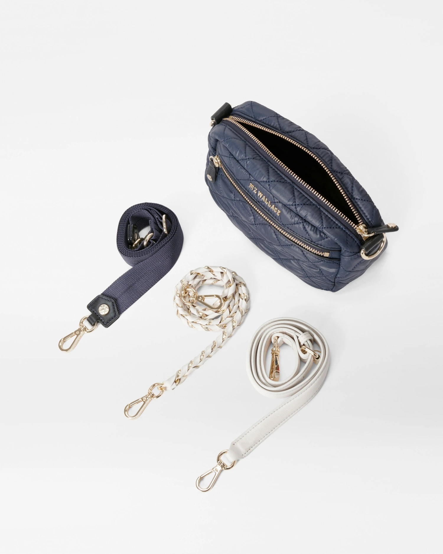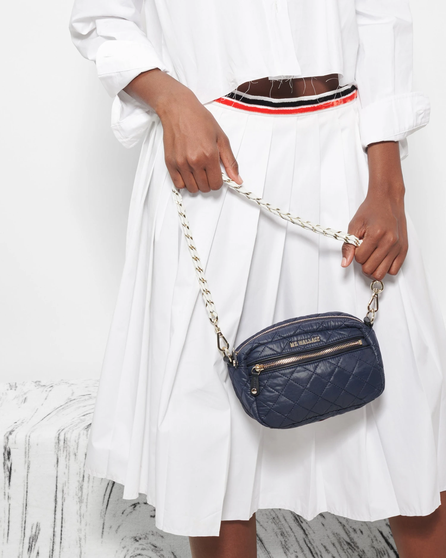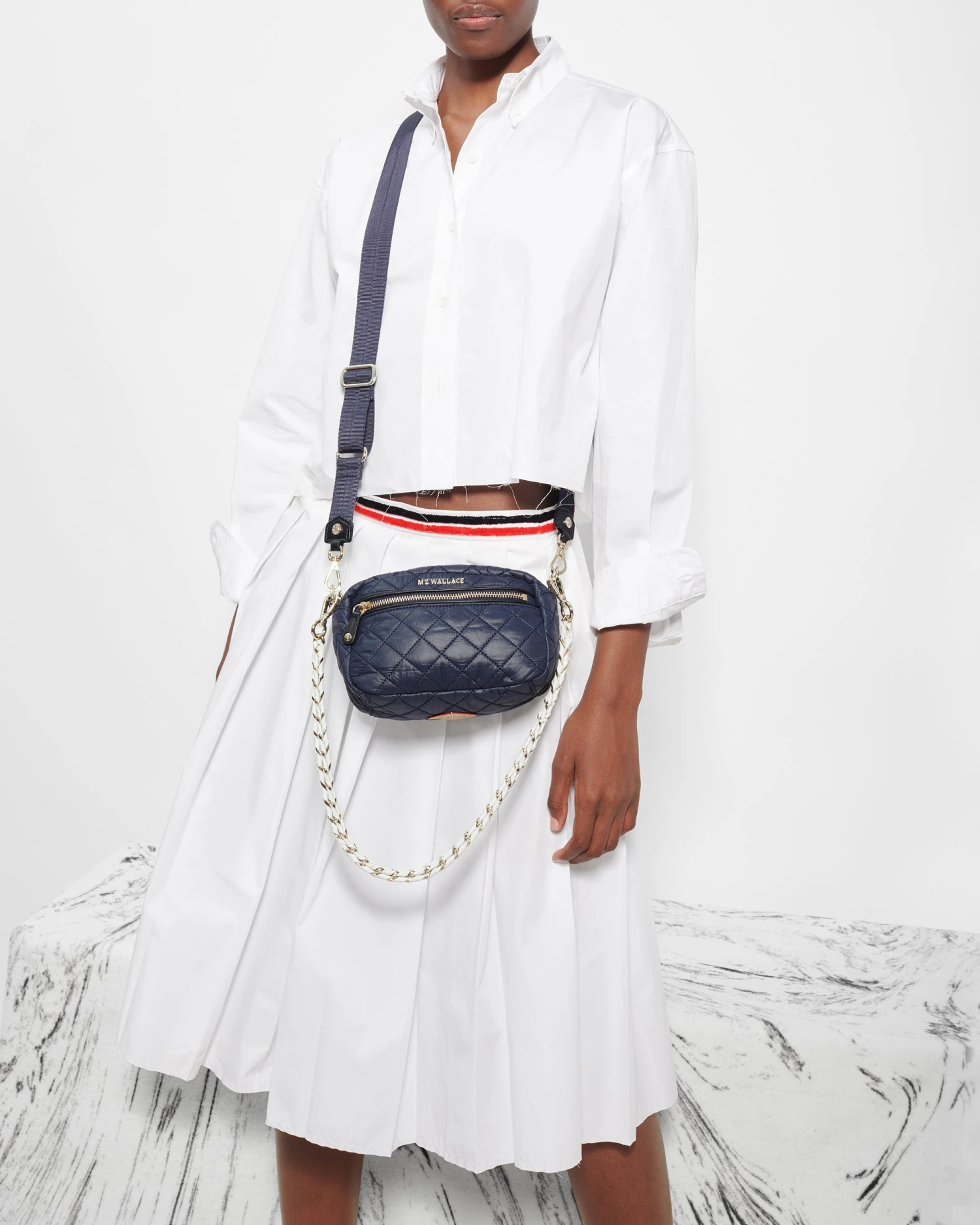We updated the Mini Crosby, now with a single zip top opening, perfectly proportioned for quick day trips and breezy summer evenings. Made from REC nylon, it has two exterior pockets and include a detachable, adjustable crossbody strap and a detachable handwoven Italian Leather strap.