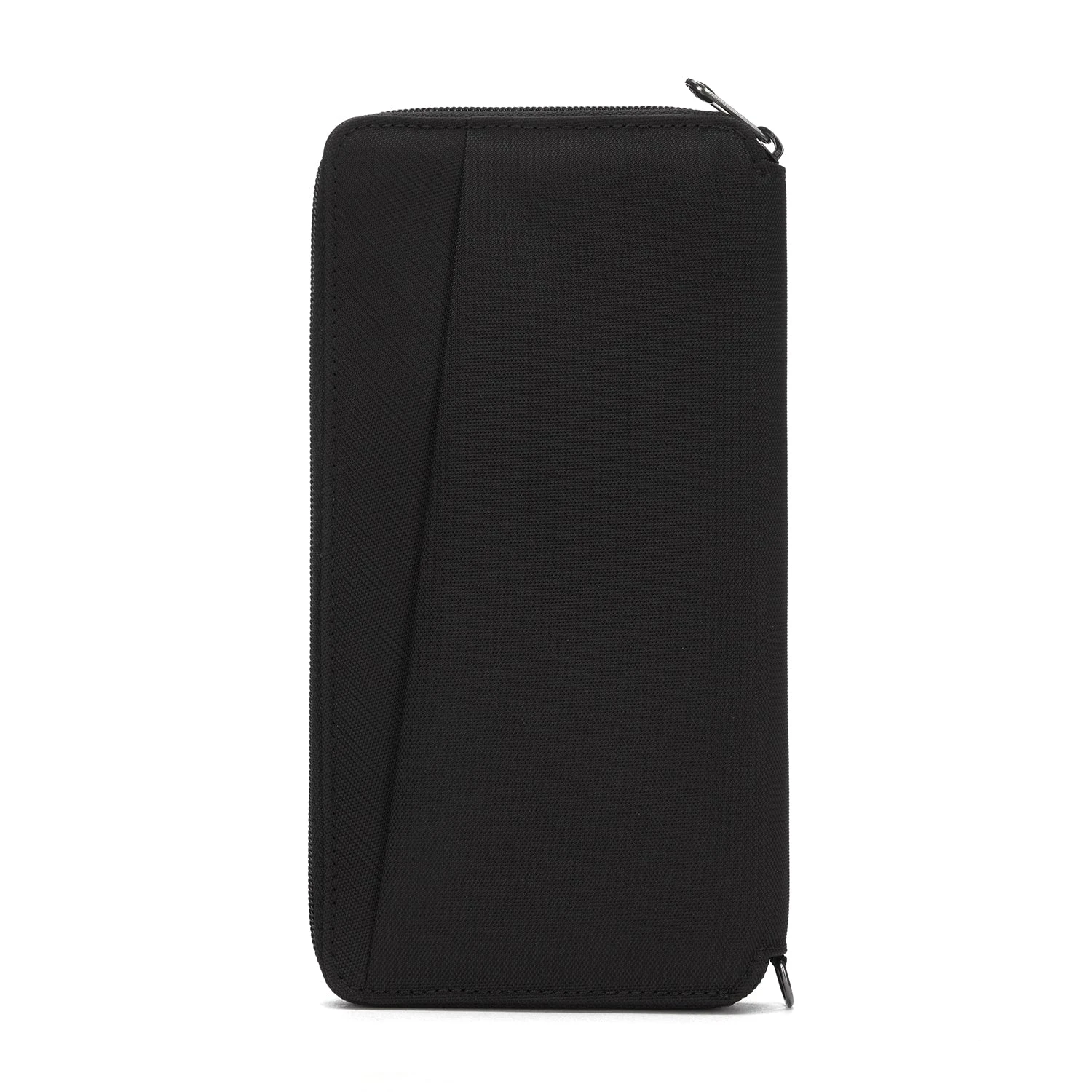 When you need to keep your passports, boarding passes, cards and cash all together, this RFIDsafe Travel Wallet will fit them all in one secure wallet. To avoid rifling through your bag looking for your passport and boarding pass, the quick access pocket on the back of the wallet lets you get instant access when you need it. It’s also perfect for traveling with a family member, as it can hold 2 passports securely. Add a cut-resistant wallet strap (sold separately) to the D-ring attachment point on the wallet or use it to clip inside a Pacsafe bag for extra security. Made with 7 recycled plastic bottles.